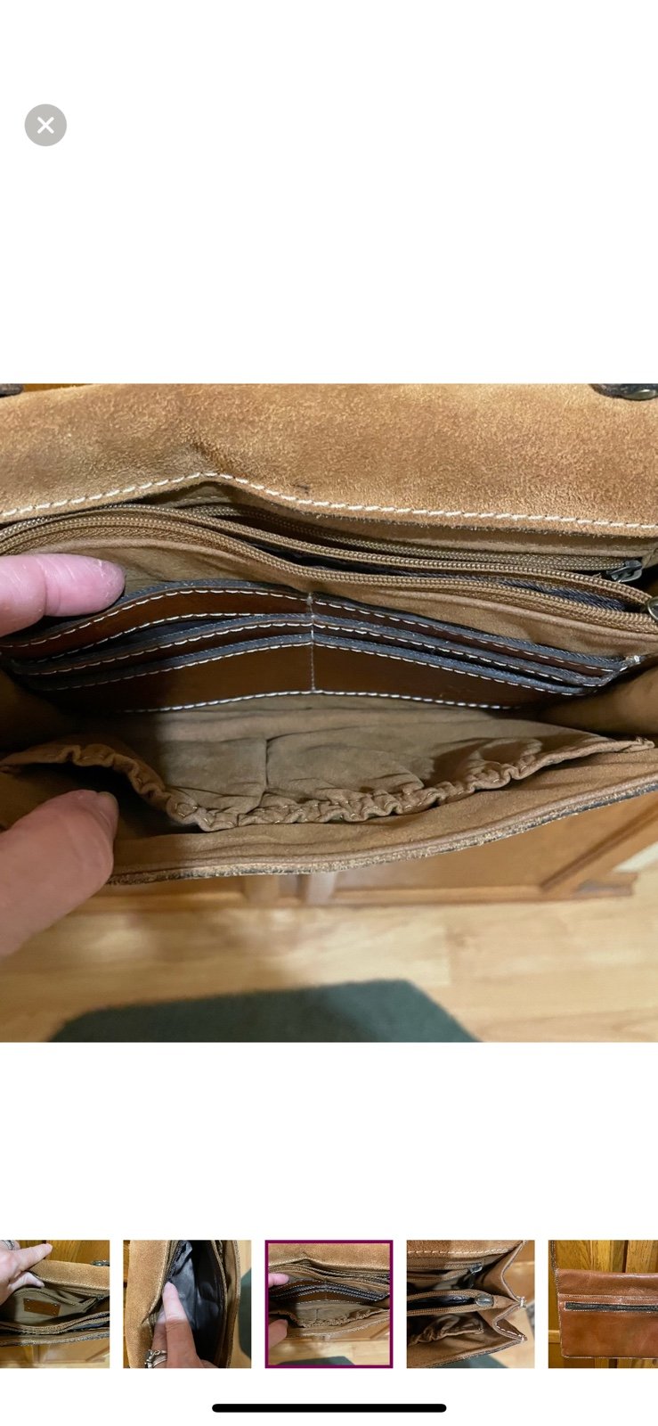 Patricia Nash tan leather crossbody. Lanza. 9 by 6 inches. Adjustable strap. Push release closure. 3 compartments-middle zips. Three other pockets-one zips. Outside zippered pocket. Leather piece by closure is loose and the design on it is faded. Hardware has some tarnishing. Inside is suede. Holds 6 cards.